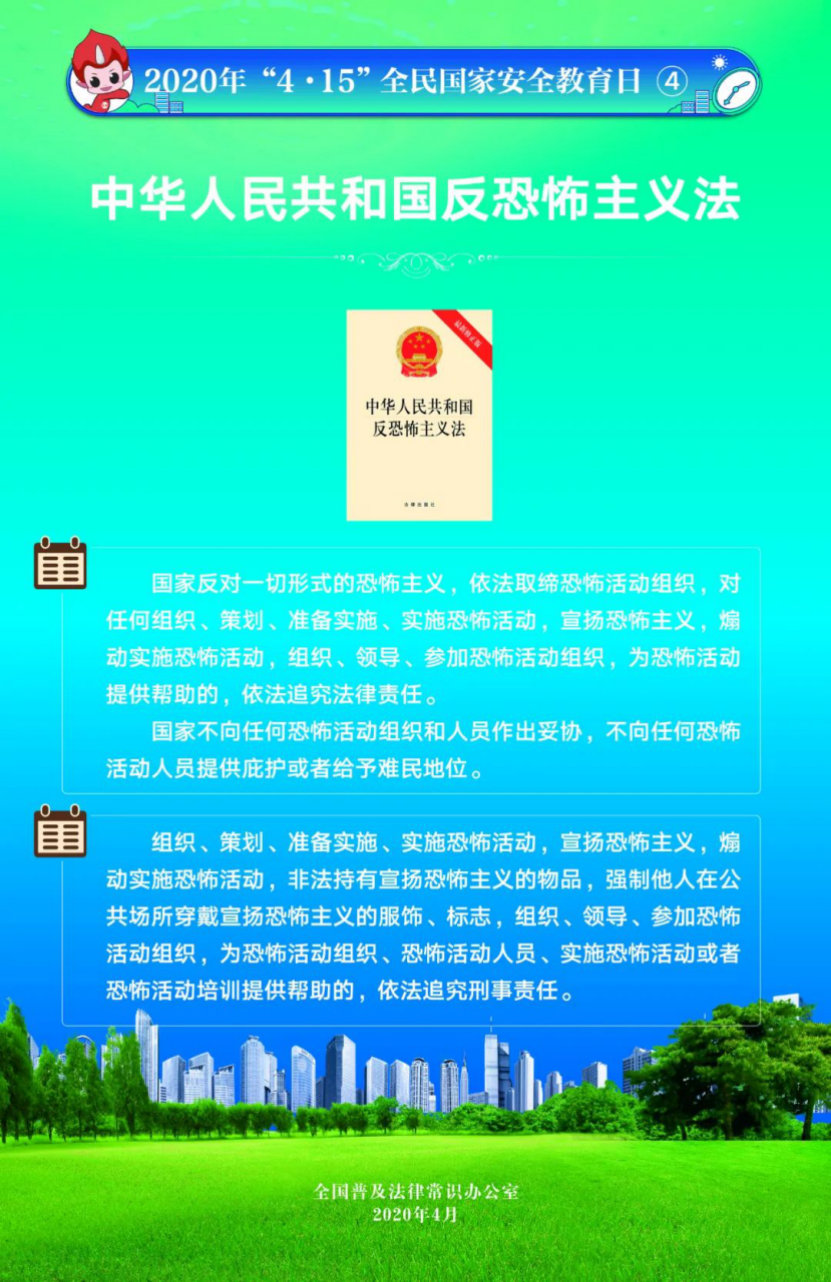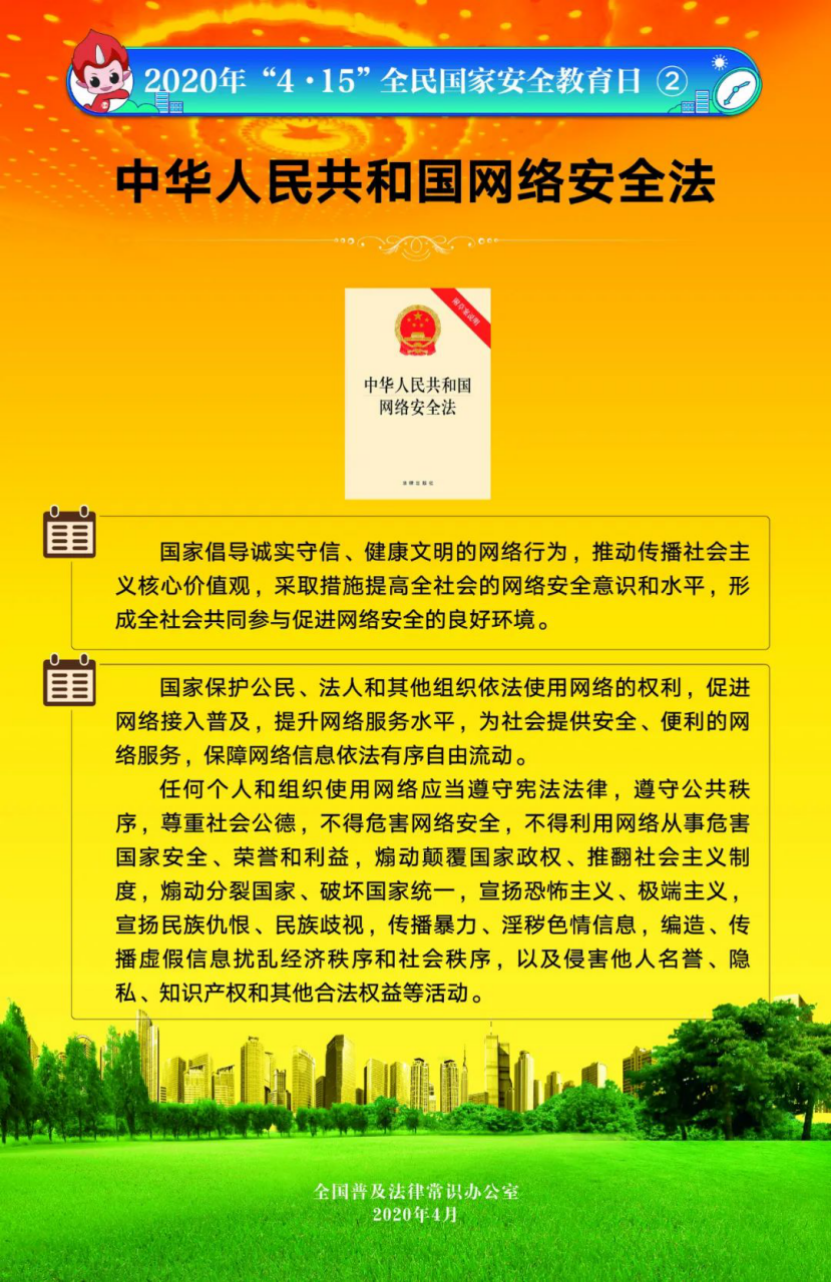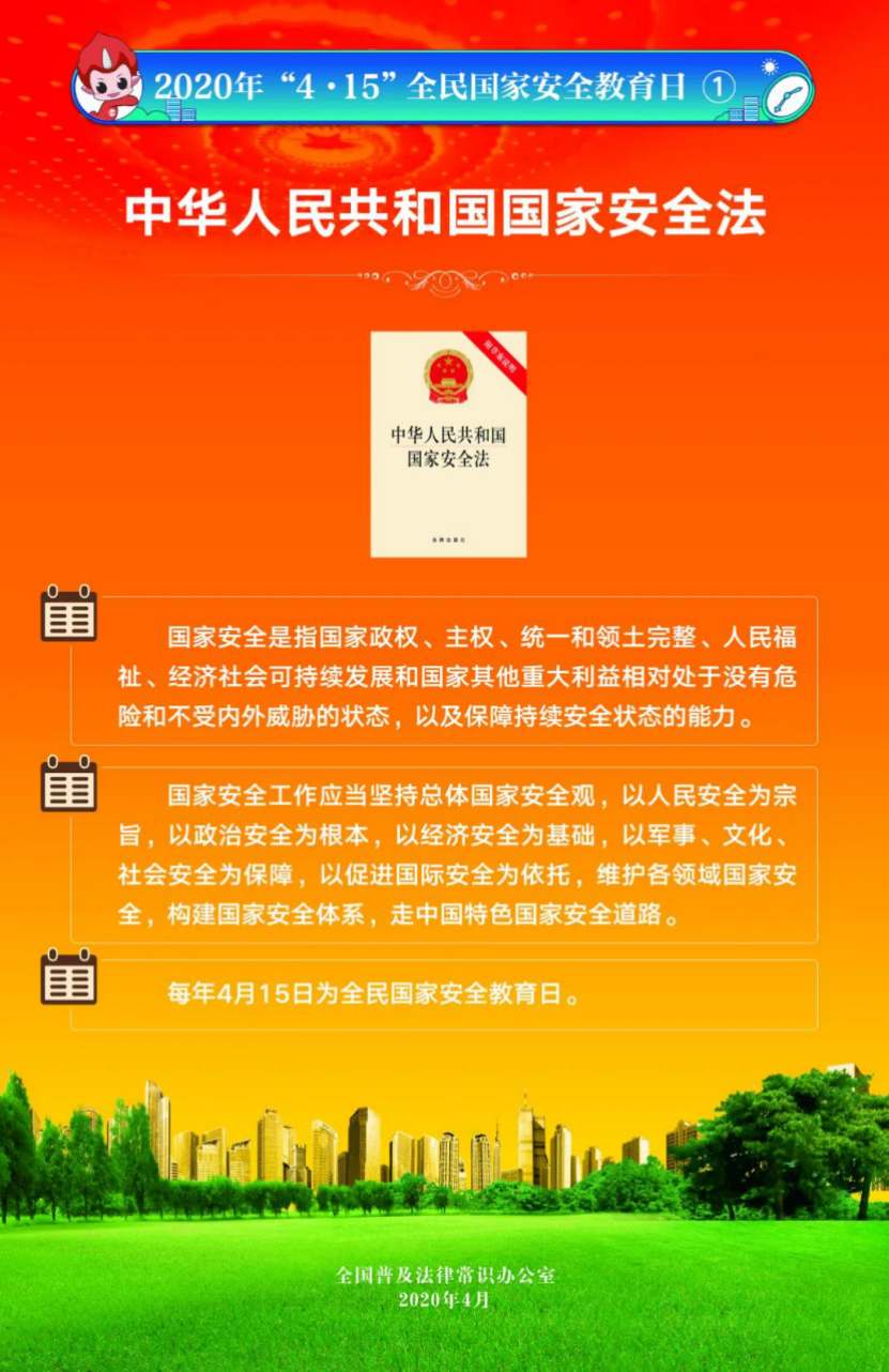 今年4月15日是第5個(gè)全民國(guó)家安全教育日。為提高全民國(guó)家安全法治意識(shí),全國(guó)普法辦組織編制了2020年全民國(guó)家安全教育日法治宣傳掛圖(一套6張),供各地各部門免費(fèi)下載使用。