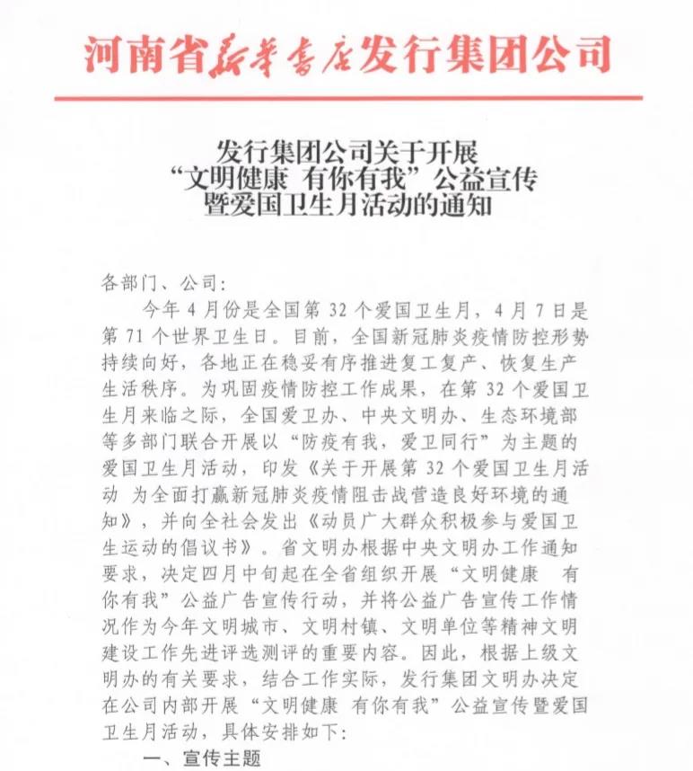 4月初,按照省文明辦“文明健康 有你有我”公益宣傳暨愛國衛(wèi)生月活動要求,發(fā)行集團積極組織開展宣傳活動,要求本部各部門努力踐行文明用餐、搞好環(huán)境衛(wèi)生,同時在書店各大賣場安排播放有關(guān)公益廣告,積極宣傳倡導(dǎo)使用公筷公勺、拒食野味等文明用餐習(xí)慣,為全面打贏新冠肺炎疫情阻擊戰(zhàn)營造良好環(huán)境。