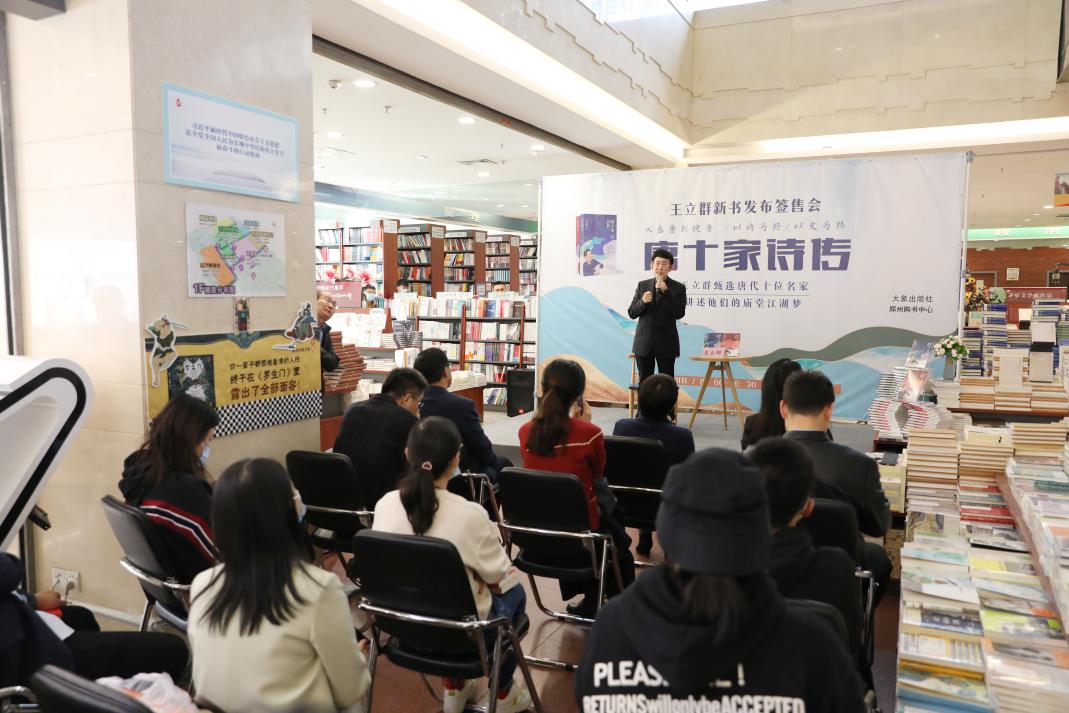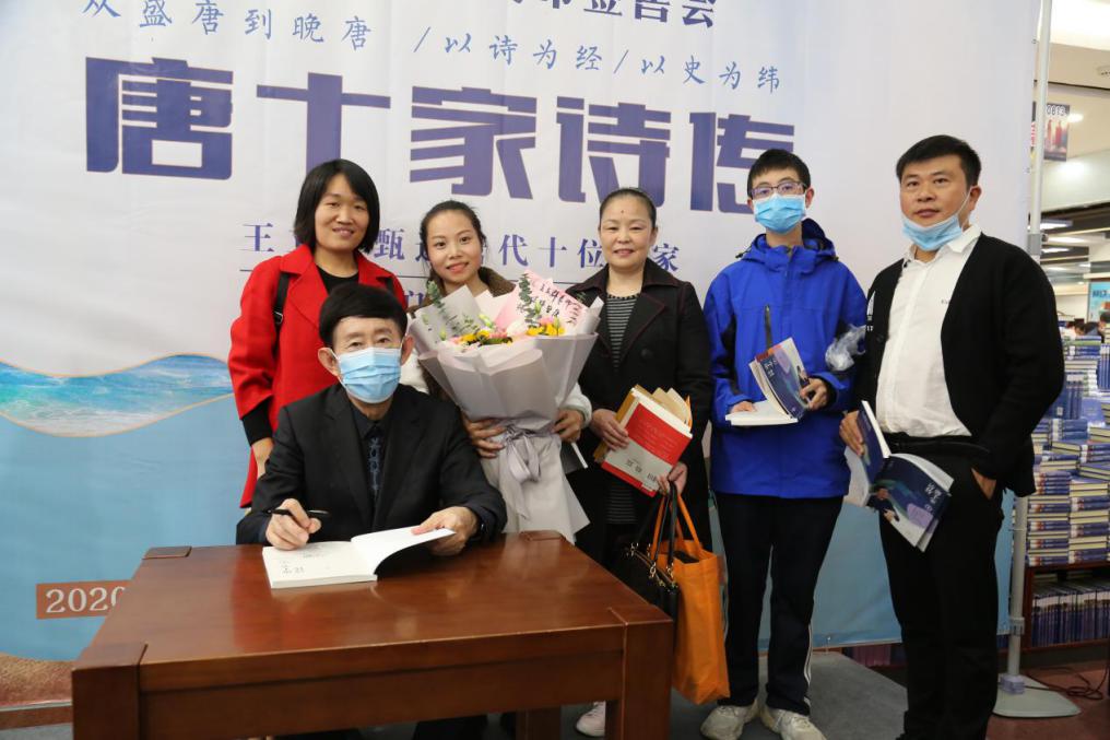 為了能與王立群先生面對面交流,上千名讀者一早來到鄭州購書中心排隊(duì)等候,還有不少讀者從外地專程趕來,有來自滎陽的詩詞愛好者,也有來自重慶的“鐵桿”書粉。王立群與讀者們真誠地分享了該書選取的主要人物,從盛唐到晚唐,以詩為經(jīng),以史為緯,深刻的解讀了一代詩人的廟堂江湖夢。在新書發(fā)布會上,王立群說,以往的唐代詩歌作品解讀類書籍,一般是通過介紹單篇作品進(jìn)行人物或作品解讀,就像一顆顆珍珠沒有串成線。在新書《唐十家詩傳》中,他在唐代眾多詩人中選了十位詩人,將這些詩人的人生,用文學(xué)散文筆法介紹其人生重要節(jié)點(diǎn)的代表作,并一一解讀,好比把一顆顆珍珠似的作品以詩人生平為線串連起來,側(cè)重講述創(chuàng)作的時間、地點(diǎn)、創(chuàng)作的緣由;顒蝇F(xiàn)場,王立群還與讀者朋友進(jìn)行了親切的互動,對讀者提出的問題,他以一個長輩的身份,從專業(yè)的角度進(jìn)行了解答,現(xiàn)場掌聲不斷。