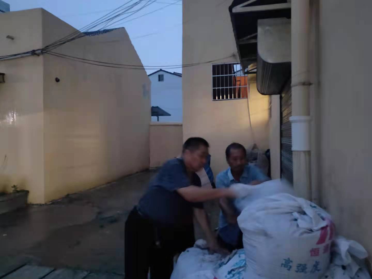 扶溝縣新華書店職工用沙袋堵住雨水進入倉庫
