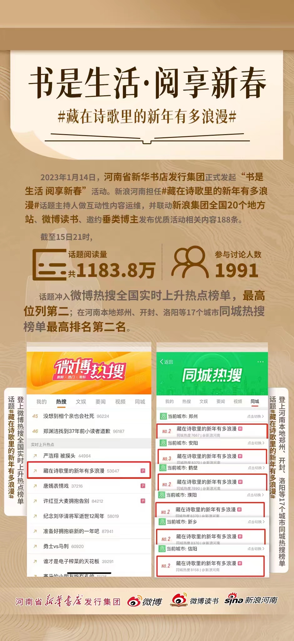 《百家講壇》主講教授王士祥、豫教音像社總編輯張瑞芳、朗誦名家肖灑等大咖做客尚書房海匯港店,把書香帶入年味兒,讓我們的節(jié)日更加有文化厚度,當(dāng)天活動(dòng)微博話題獲得全網(wǎng)970萬閱讀,精彩的活動(dòng)內(nèi)容讓線上線下的廣大讀者紛紛點(diǎn)贊,躍居全國(guó)實(shí)時(shí)榜和同城熱搜榜第2位。至此,“詩(shī)詞里的年味兒”活動(dòng)拉開了河南新華書店新春閱讀推廣序幕。
