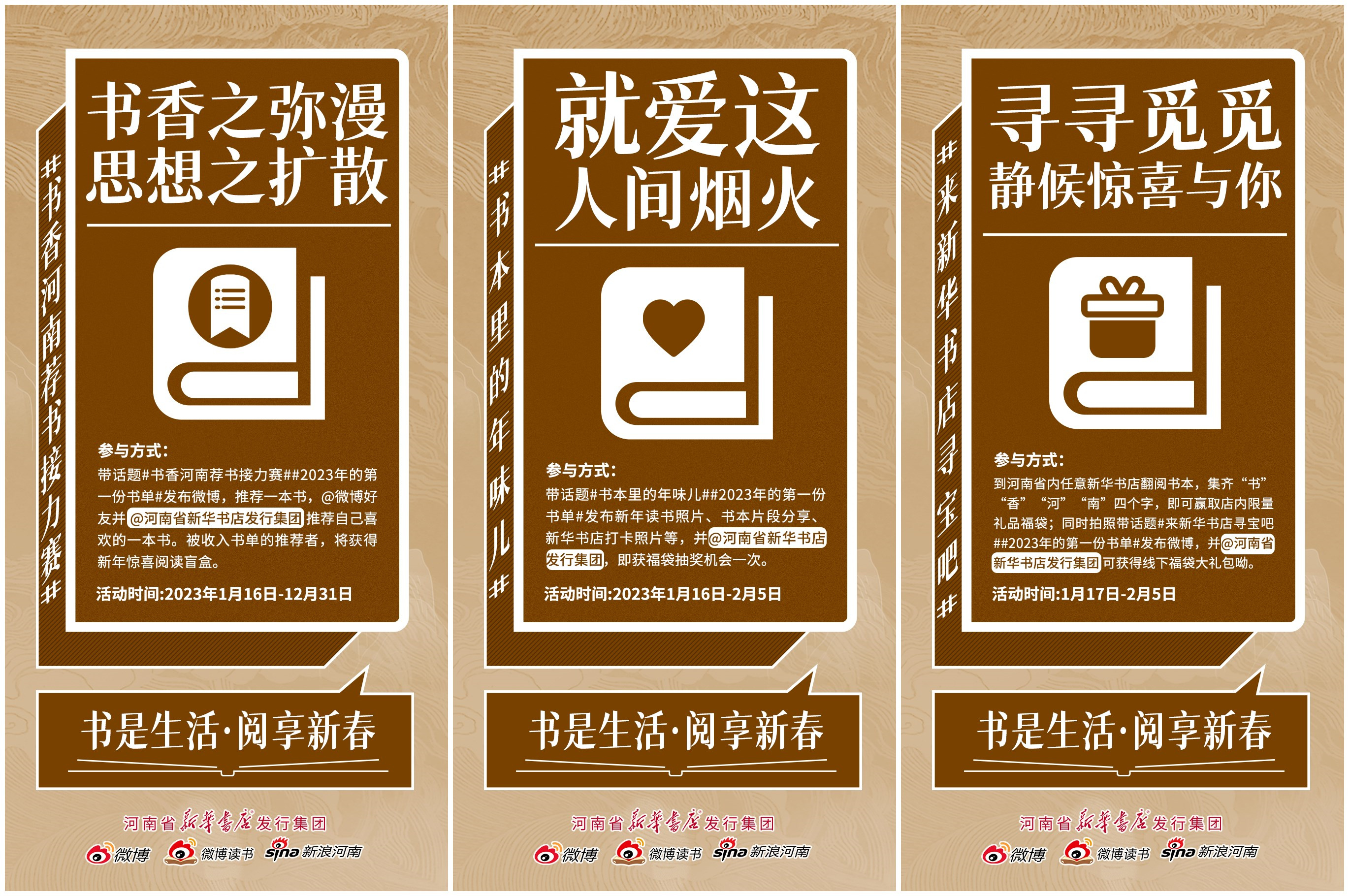 河南省新華書店圍繞2023年“癸卯吉年·書香賀歲”春節(jié)主題,還精心策劃了線上“書香年味兒”、“書香接力賽”薦書、老家河南年味濃等系列活動(dòng)。百姓文化云平臺(tái)將開展專題對(duì)#舌尖上的河南年味兒、#新年就要這樣“游”、#春節(jié)非遺不打烊、#新春節(jié)目連連看進(jìn)行內(nèi)容展播。