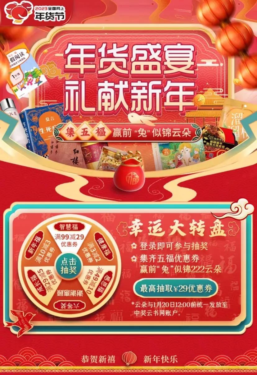 讀者還可參與云書網(wǎng)線上商城“集五福”得前“兔”似錦222云朵營(yíng)銷活動(dòng);還有新年禮遇新人、紅包文創(chuàng)用品買1贈(zèng)1等線上線下活動(dòng),更有超多圖書折扣,優(yōu)惠券等你拿。1月25日-1月27日,云書網(wǎng)將開展“新春讀好書,文化過大年”直播帶貨活動(dòng),關(guān)注“河南新華書店直播間”,每天精彩直播為你推薦正版福利好書,與主播互動(dòng)可享更多優(yōu)惠哦。