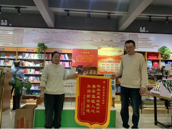 10月18日,市民讀者薛女士來到修武縣店賣場(chǎng),將一面繡有“敬業(yè)正直品德高尚 善舉溫暖人心 弘揚(yáng)新華美德”的錦旗贈(zèng)予縣店員工王林征,并再三對(duì)其表達(dá)感激之情。