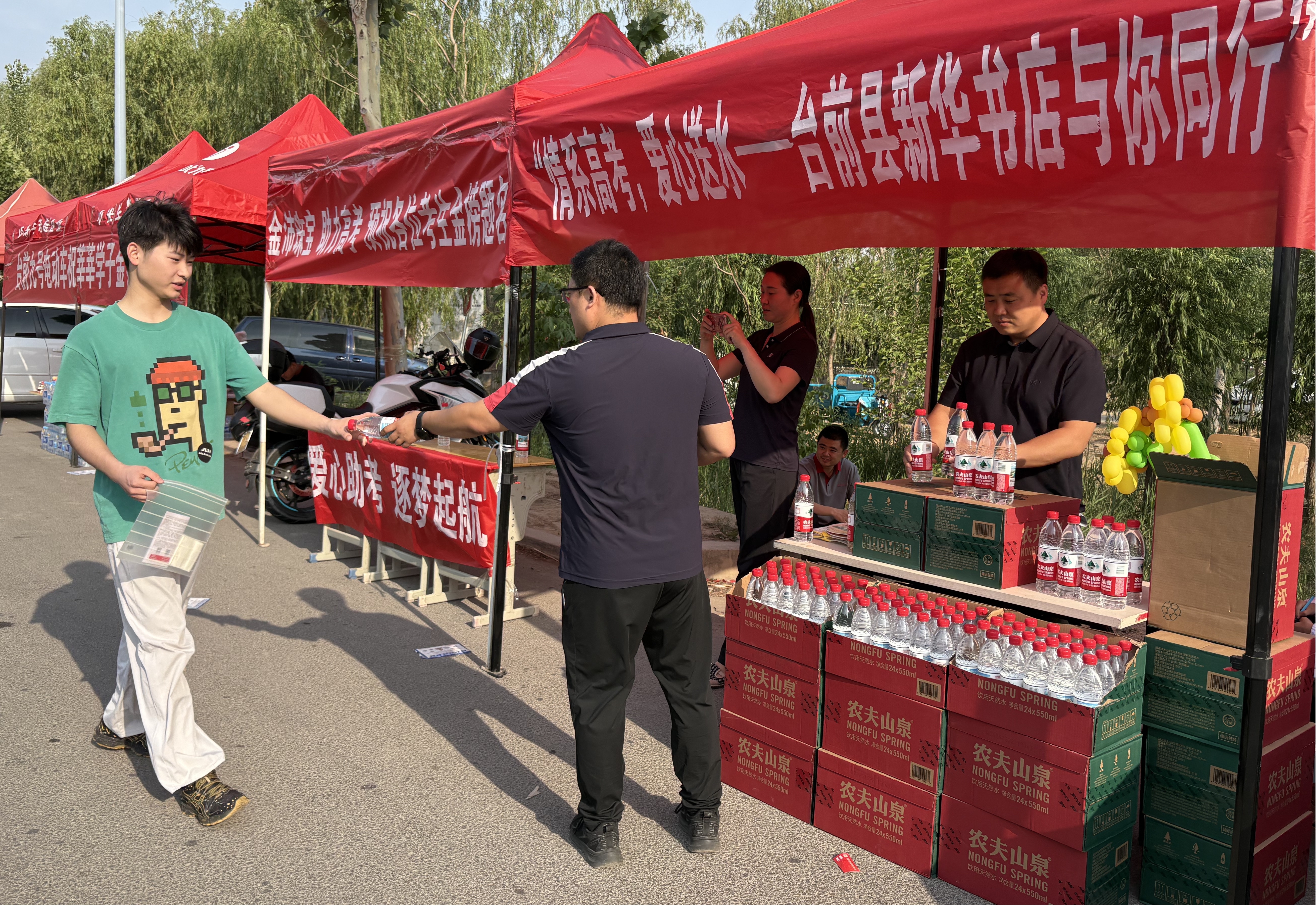 6月7日,高考首日,臺前縣新華書店在縣第一高級中學考場門口設立“愛心助考志愿服務臺”,為考生提供免費飲用水,以實際行動為學子們送上清涼關懷與誠摯祝福,助力他們以最佳狀態(tài)迎戰(zhàn)高考。以點滴關懷緩解暑熱,用真誠行動傳遞溫暖,考點邊的“新華紅”成為高考期間一道溫暖人心的風景線。