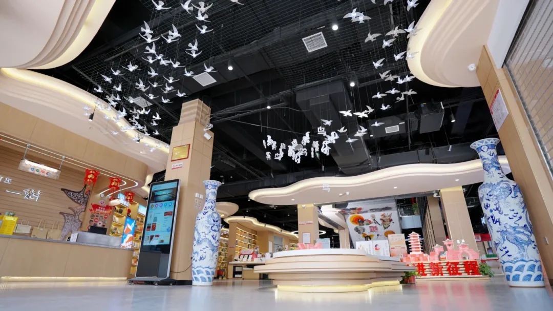 以“殷商文化”為核心的商丘市新華書(shū)店凱旋路店,營(yíng)業(yè)面積達(dá)3000平方米,店內(nèi)陳列覆蓋社科、文學(xué)、藝術(shù)、科技、生活、少兒、教育等圖書(shū)4萬(wàn)余種、10萬(wàn)余冊(cè),并設(shè)置了文化閱讀、多元文創(chuàng)、藝術(shù)展示、交流分享、AI自習(xí)室等多個(gè)專區(qū),是一個(gè)集文化學(xué)習(xí)、社交互動(dòng)、文藝展覽于一體的多功能文化閱讀空間。在空間表達(dá)上,凱旋路店深挖地域文化元素,特別是“玄鳥(niǎo)生商”的甲骨文飛鳥(niǎo)造型環(huán)頂一樓整個(gè)大廳,藝術(shù)區(qū)的“梁園八景”古樸燈箱與文房四寶交相呼應(yīng)營(yíng)造典雅文化氛圍,李白《梁園吟》的石壁雕刻讓很多前來(lái)的家長(zhǎng)和孩子駐足欣賞、輕輕吟誦,以及“應(yīng)天文化講堂”活動(dòng)專區(qū)舉辦的“朗讀者沙龍”“我是經(jīng)典傳誦人”等系列豐富閱讀活動(dòng),為讀者提供高品質(zhì)的文化體驗(yàn)。此外,凱旋路店積極探索“文化+科技”的創(chuàng)新融合,在三樓和負(fù)一樓打造的數(shù)智AI自習(xí)室和科普研學(xué)實(shí)踐基地即將落地,為讀者帶來(lái)智能化、趣味性的全新體驗(yàn)。